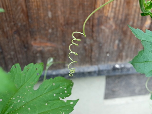 植えてみて新たにわかったことが1つ。ゴーヤのツルってバネだったんですね〜。知っている人なら当たり前の話なんでしょうが、私は知りませんでした。