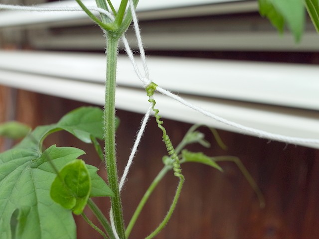 ゴーヤは茎を伸ばす時にいっしょにツルも伸ばし、回りの支持材にそれを巻き付けていきます。自身をしっかり支えていこうというわけでしょう。よく観るとそのツルがバネ状になっています。なんで?
