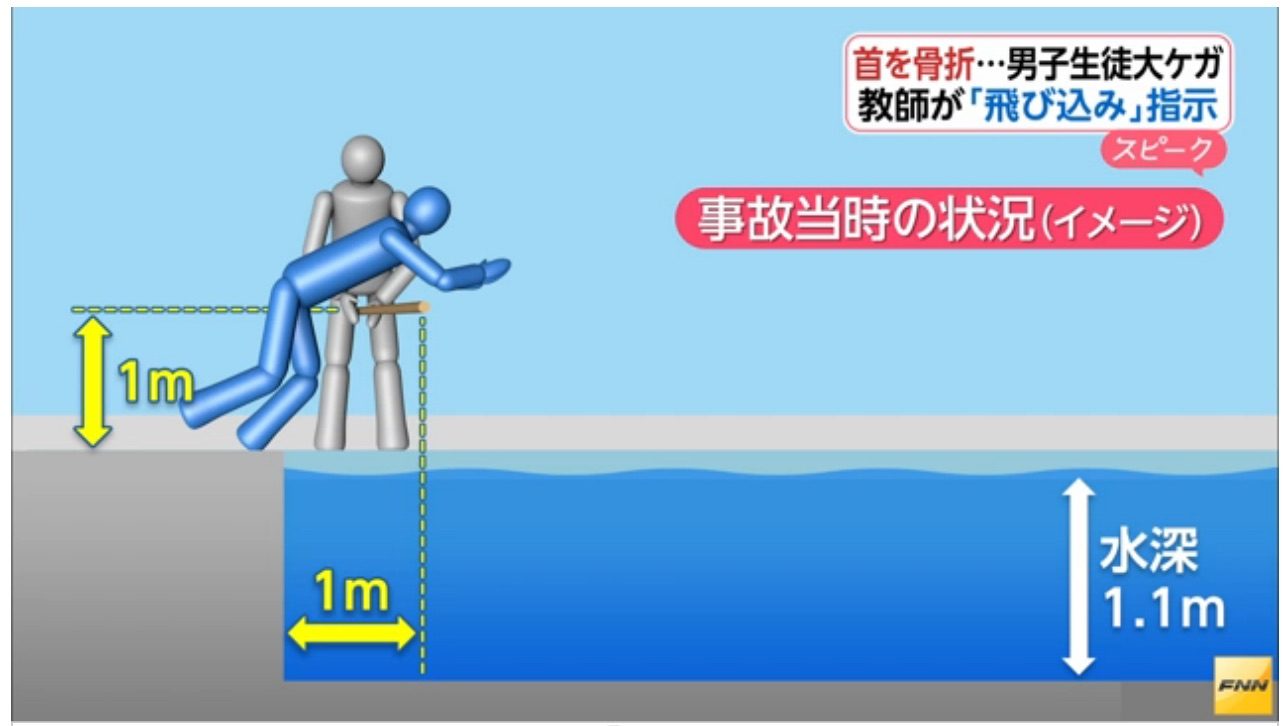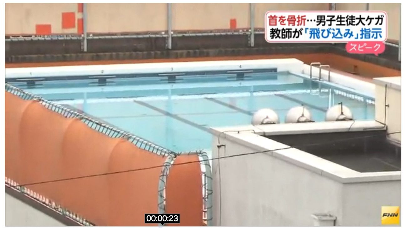 東京都教育委員会によると、2016年7月、水泳の授業で、男性教諭が3年生の男子生徒に対し、スタート位置から1メートル離れたプールサイドで、1メートルの高さにデッキブラシの柄を伸ばし、柄を超えて飛び込むように指示した。当時の水深は、通常よりも浅い1.1メートルだったということで、生徒は、プールの底に頭を打ち、首の骨を折る大けがをした。(フジテレビ系 FNN 9月27日)