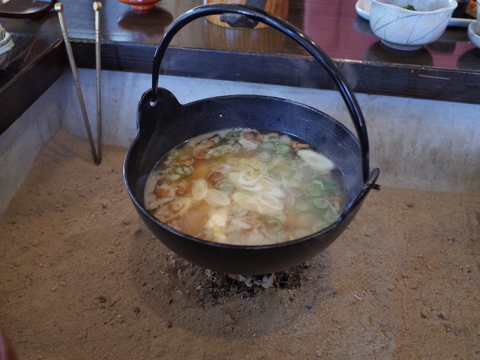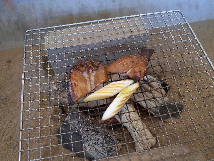 ご飯のお供になりそうな惣菜いろいろ。炭火の焼き魚はイワナの味醂干し。平飼い鶏卵の温泉卵。囲炉裏鍋の味噌汁には野菜や豆腐がいっぱい。地産地消の食材の滋味深い味わいに箸が進みます。