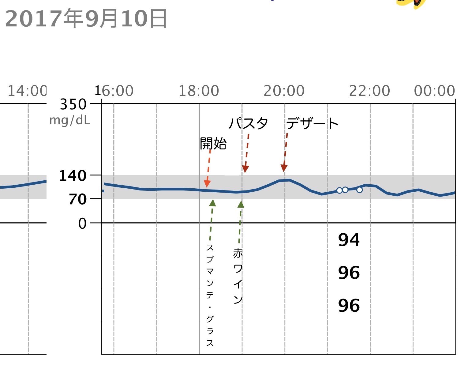 問題はデザート。パスタの後お肉料理と焼き野菜を食べた後、デザートがテーブルに出てきたのが20時少し前。でも、このピークは1時間後にはなく、次の山は22時で2時間後に出ています。おまけにピーク値は糖質量から考えるとかなり低め。