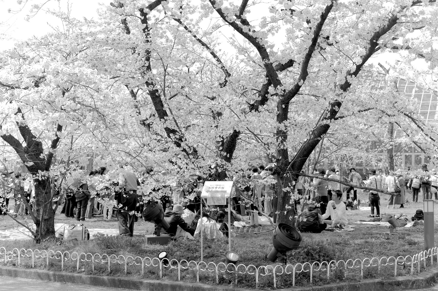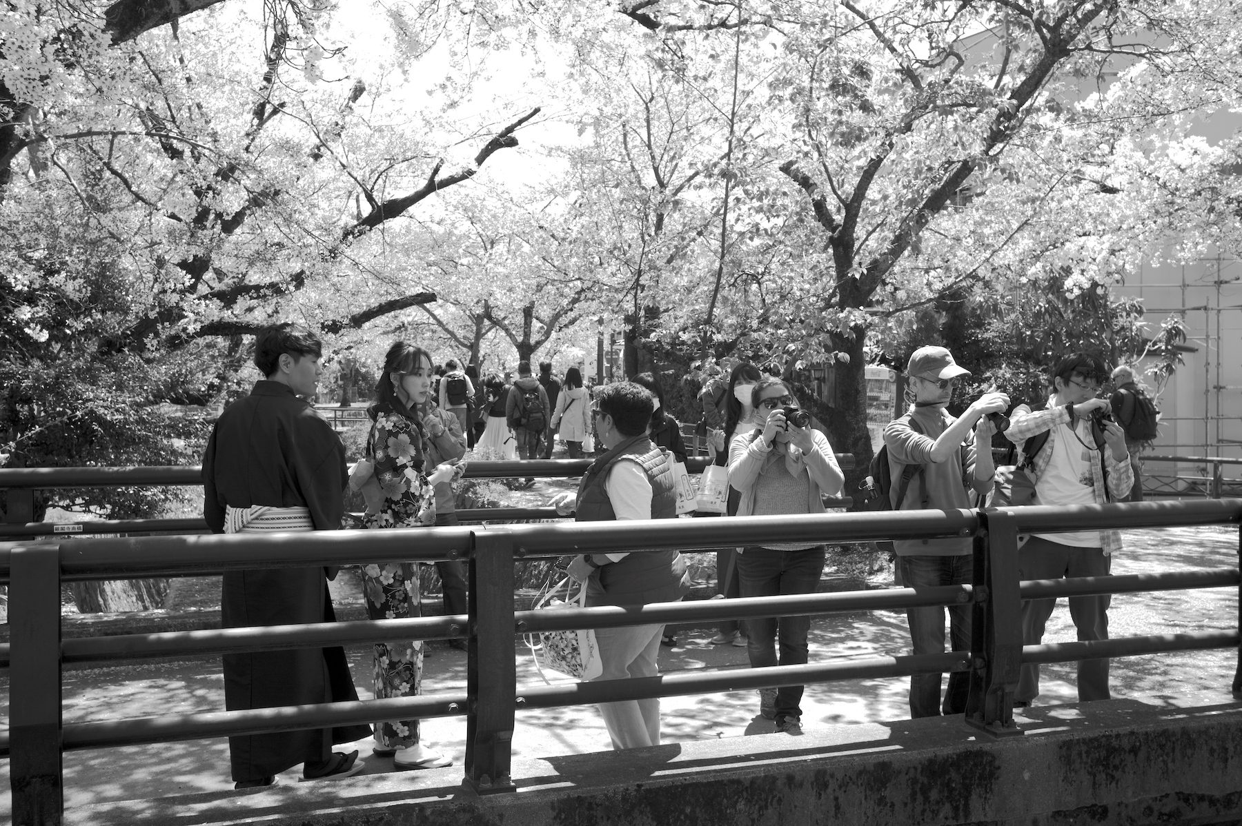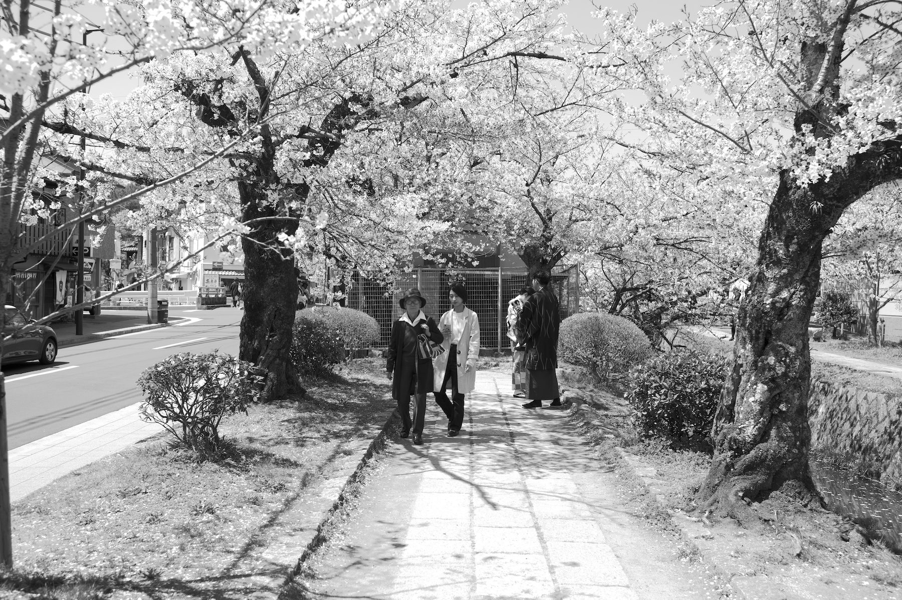 京都の桜 2019 2019/04/19 .foto 京都の植物園は桜を愛でる人でいっぱい。(2019年4月7日) 天候の寒暖の妙なのか、今年の桜は長く楽しめました。こんな年は珍しい。 芝生の中で歌会・宴会やってもお咎めなし。桜の季節のサービスなのでしょうか。 大きな桜はまるで巨大なサーカスのテントです。 毎年心から桜を楽しめる、そんな未来であってほしいもの。 それにしても桜の花はボンボンみたい。 色合いよりも形態で観る方が印象には残り易い。 場所は変わって、哲学の道。(2019年4月13日) 和服で楽しむ人もちらほら。 和服の日本人に是非いっしょに写真に入ってほしいと懇願する外国人の気持ちもわかる。 カフェの外壁の椅子には経済観念しっかりの外国人がいっぱい。 それにしても桜は美しい。これから暖かくなる時の流れを感じさせるのもマル。 動物園から鴨川に続く疎水べりも桜の名所。正面は東山、左手は踏水会。 今年2019年の京都の桜を少し紹介しましょう。全部モノクロなので色合いはご想像でよろしく。 枝垂れの幸 散りてもなお咲く…ra
