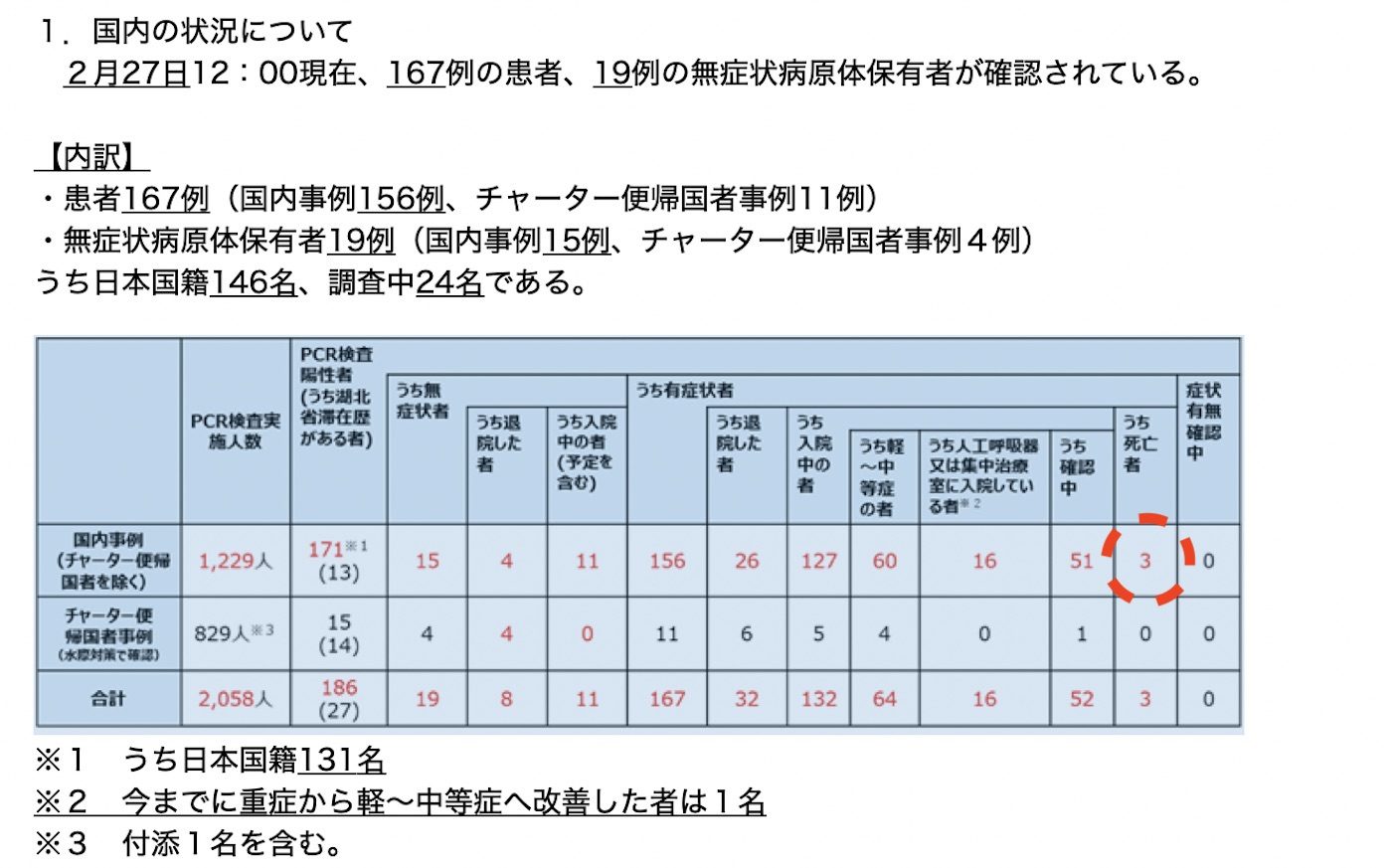 まず26日時点での厚労省の資料(新型コロナウイルス感染症の現在の状況と厚生労働省の対応について(令和2年2月26日版))では以下の通り。ただし、表中赤丸は有田が付記。