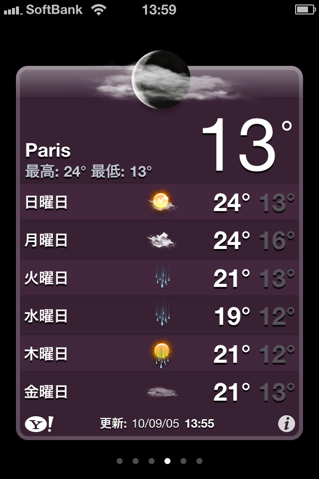 パリは涼し? 2010/09/05 .opinion 9月だというのにまだまだ暑い日が続いていますが、お変わりございませんか? もう数週間で遅い夏休みのフランス、そこでパリ等の気温を調べてみると...、あらま、意外と涼しいんですねぇ。 24、5℃の気温となると服もそれなりになるので、調子がくるいそう。 (お詫び)最初iP4からアップロードしたら、写真のサイズや場所の編集ができずにデカイものを見せてしまいました。ご免なさい。 FROM偽装メール クラウドの一歩いや半歩?