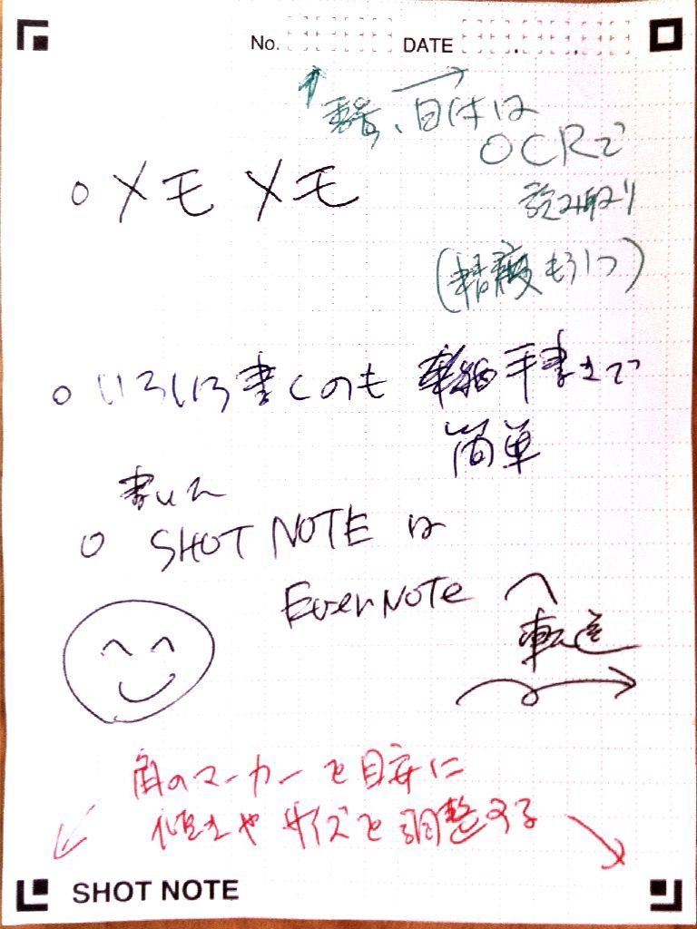 やっぱり手書きメモが一番かな〜と思っていたところ、今回出てきたSHOT NOTEは有り難い。書く時は普通の紙のメモ帳だから従来通り。これをiPhoneのカメラでパシャッ。すると専用アプリ(無料)が四隅につけられたマーカーをたよりにメモ書きを水平垂直補正しながら画像として記録します(ここが売りですね)。さらにそのメモをEvernoteに転送することもできるという優れもの。手書きメモに比べると、iPhoneでの撮影が余分な作業になりますが、そのことで記録が電子化されますので保管や管理が便利になります。後者の利点が大きい人にはSHOT NOTEは垂涎モノでしょう。私がそうです。
