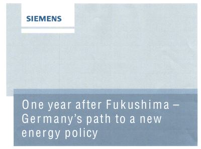 まず、エネルギー部門CEOであり、かつジーメンスAGの取締役でもあるミハエル・ズイス氏の今後の見通し表明、次に「フクシマから1年、日本の電力供給についての寸評」、三番目が「フクシマから1年、ドイツの新しいエネルギー政策」で、これに一番の力点が置かれ、8ページのレポートの半分以上を占めています。そして最後にフクシマが世界のエネルギー政策に与えた影響について中国、米国、フランス、スイスの状況について簡単に触れられています。